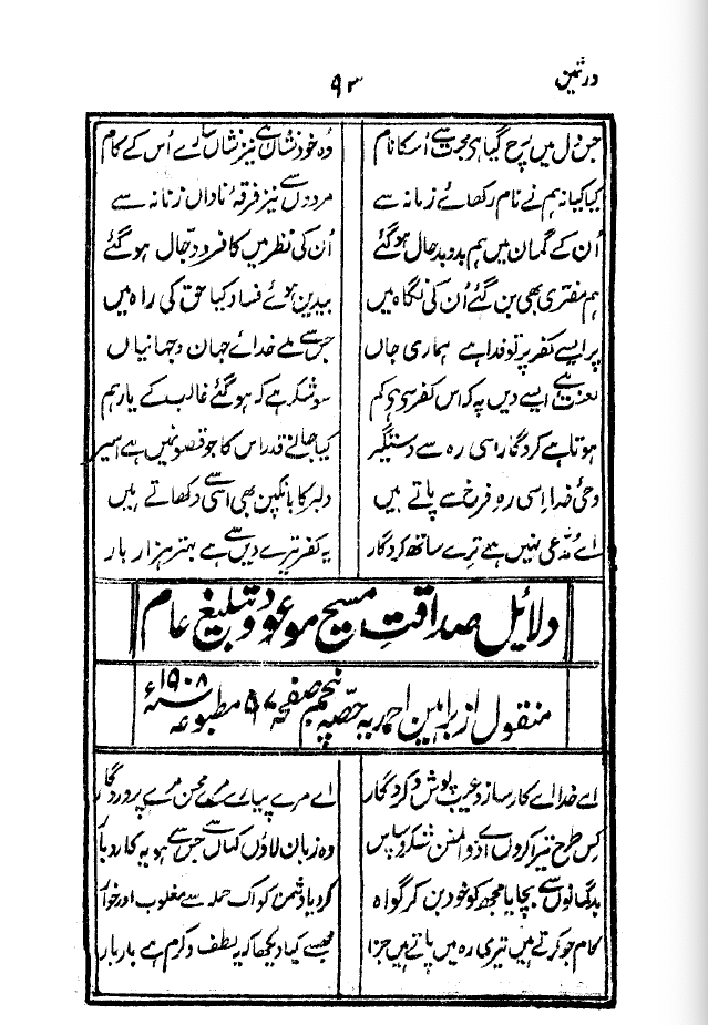 So my translation (of this poem by Hazrat Mirza Ghulam Ahmad) is, to use my aforementioned “mapping” metaphor, mapped-on to—and closely follows—the narrative of his poem titled A Paean to Islam and to its Founder, one that he published in 1893 as part of one of his books.