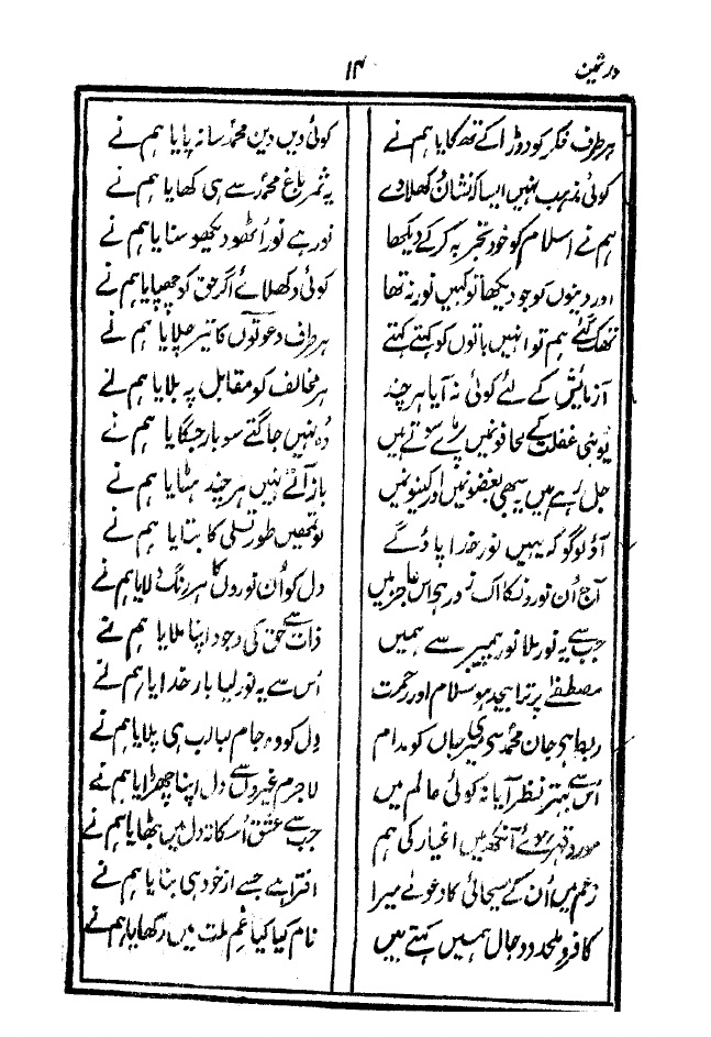 For my being to resonate with the life of Prophet Mohammad, thus so have I my Lord besought; My life without him is nought—the blessed Prophet is all I got My spiritual thirst was, in his obedience, quaffed—a delight; In him I saw daylight when all else was gloomy night